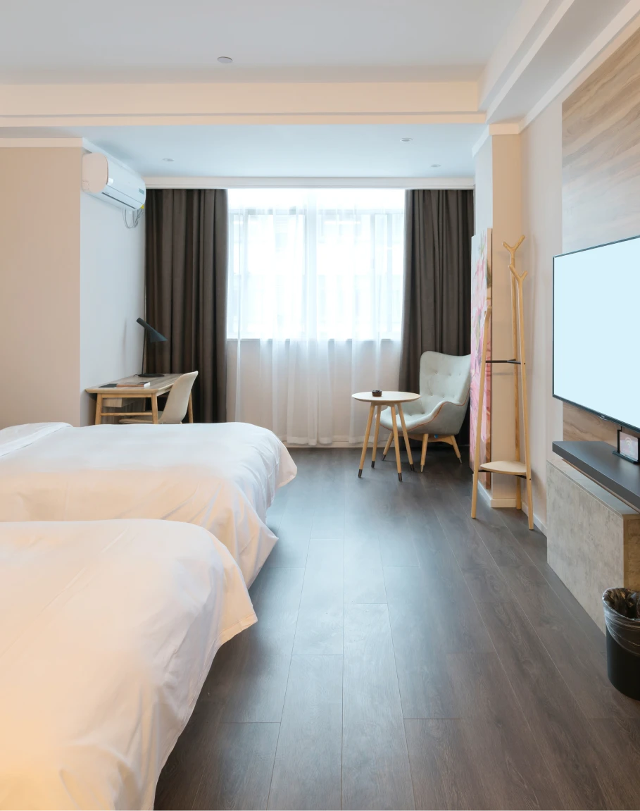 Varied types of rooms, from standard to luxury suites, equipped with essentials like beds.