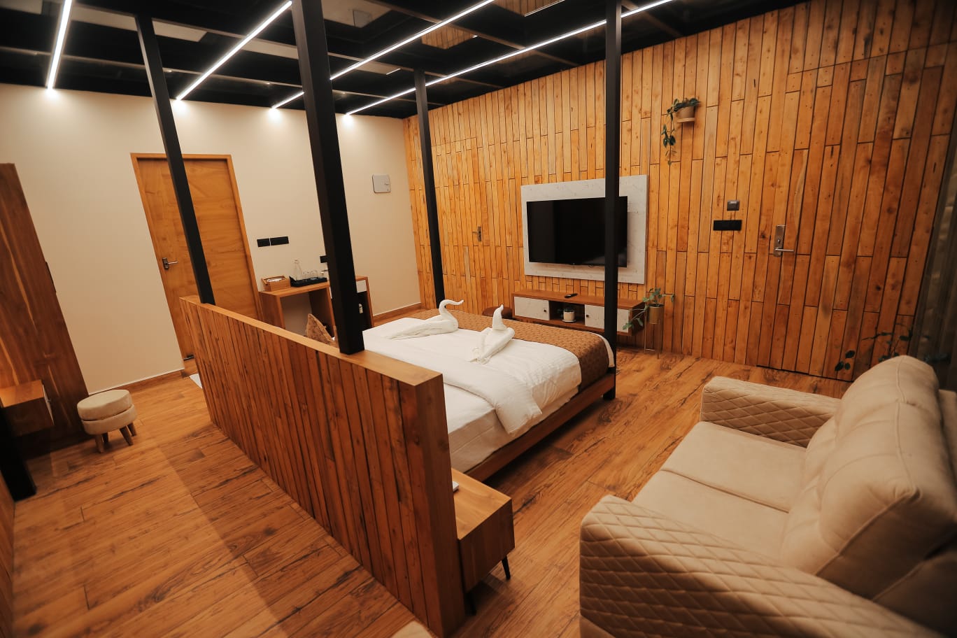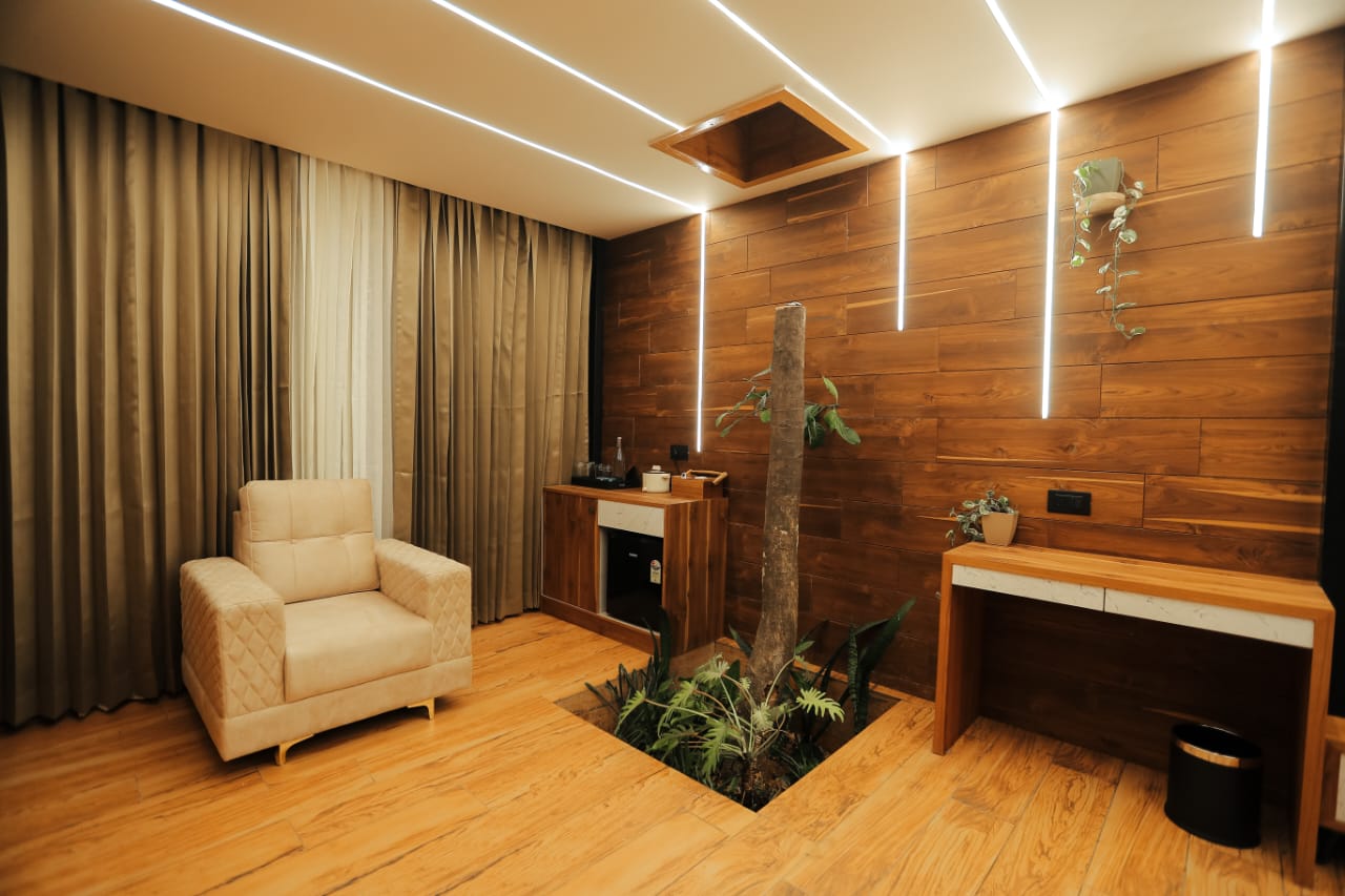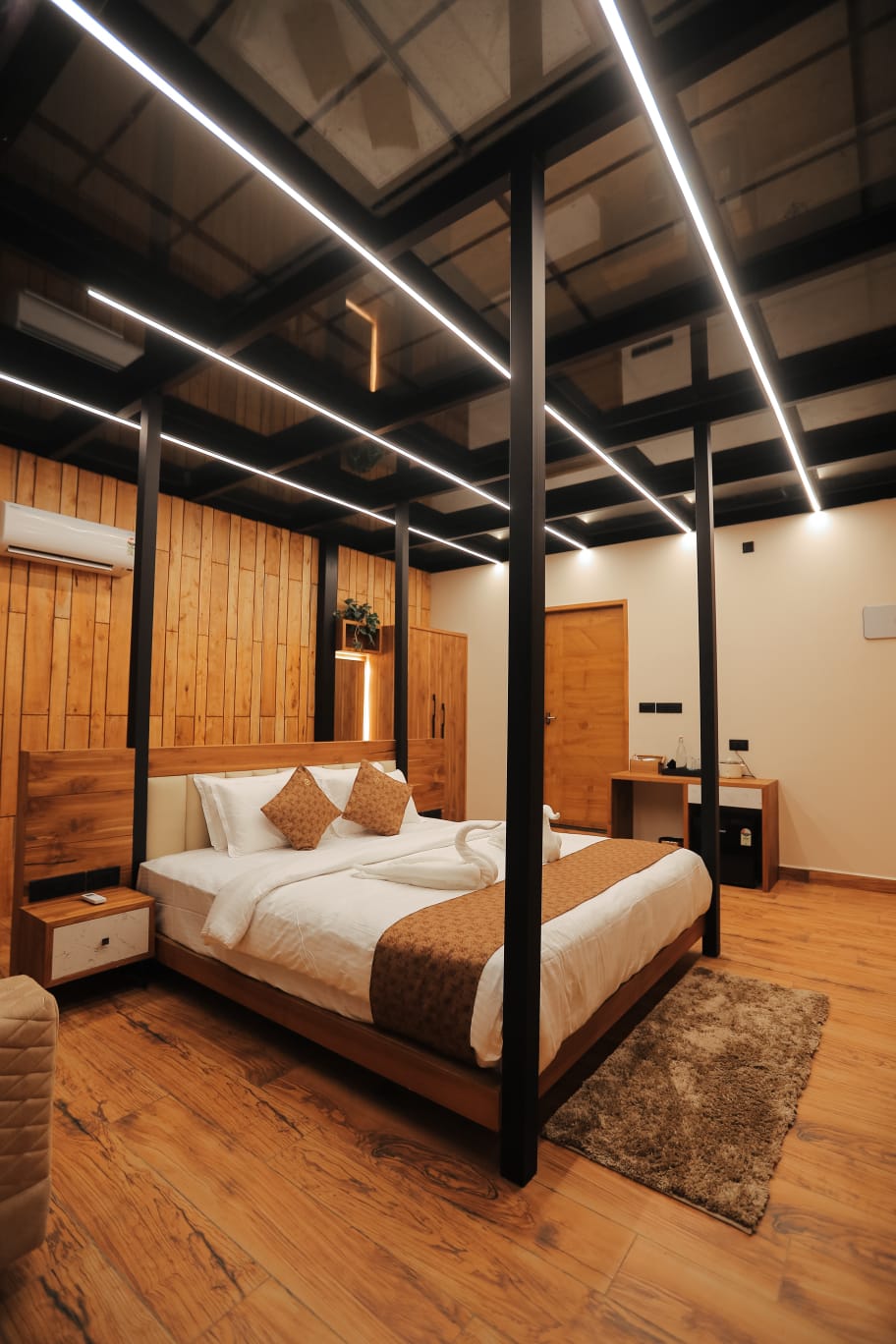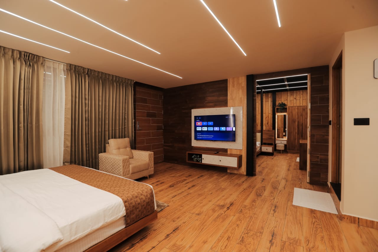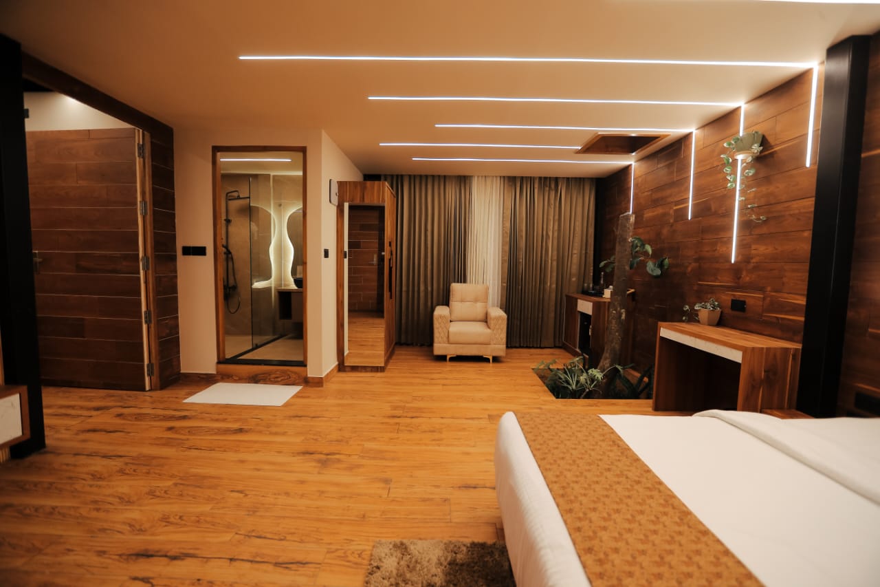 Each cottage features spacious interiors with contemporary furnishings and large windows that frame the breathtaking views of Wayanad's lush landscapes. The stunning artistic aquarium rooftop creates a mesmerizing underwater ambiance, allowing you to gaze at colorful marine life while relaxing in your elevated sanctuary. The transparent ceiling design brings the beauty of aquatic life right above you, creating an immersive experience that blends nature's artistry with modern luxury. The glass roof room features a luxurious bathtub, perfect for unwinding while enjoying the unique aquarium rooftop view above.