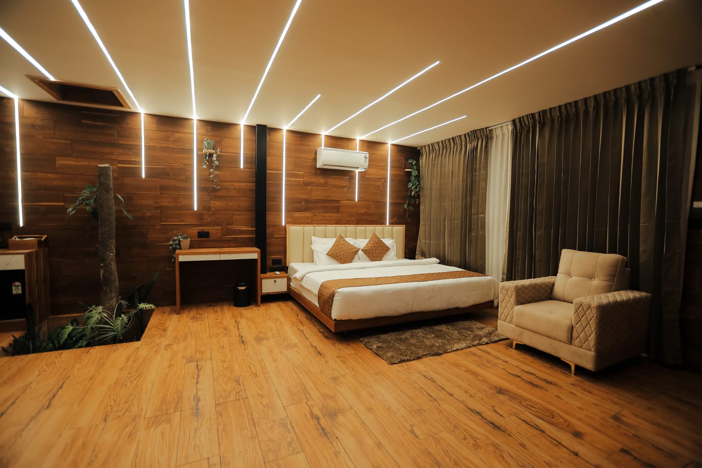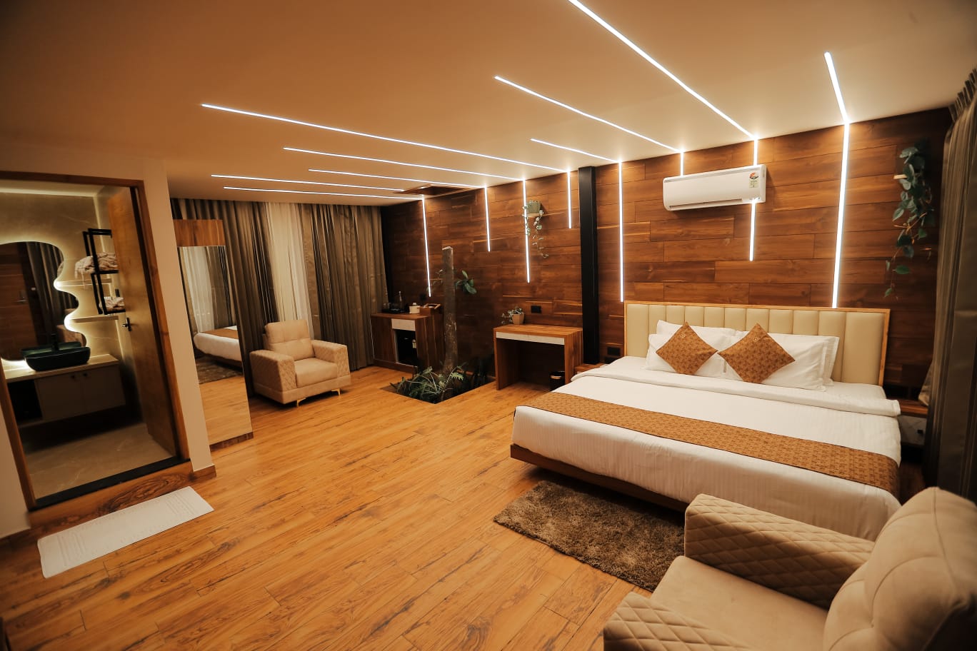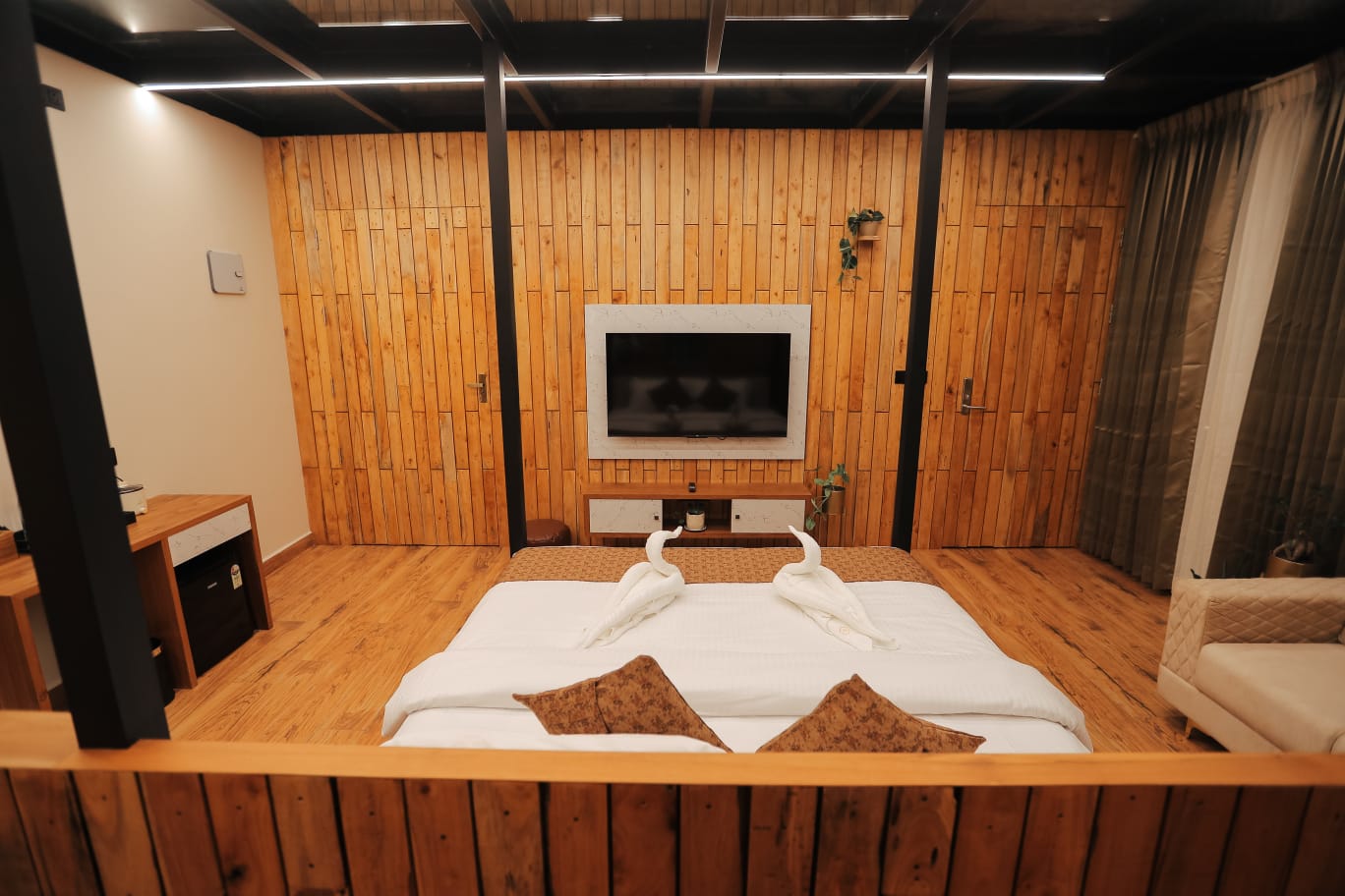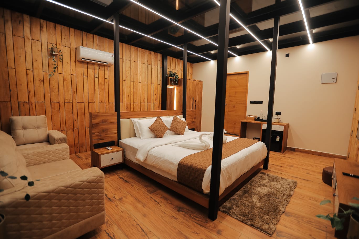 Each cottage features spacious interiors with contemporary furnishings and large windows that frame the breathtaking views of Wayanad's lush landscapes. The stunning artistic aquarium rooftop creates a mesmerizing underwater ambiance, allowing you to gaze at colorful marine life while relaxing in your elevated sanctuary. The transparent ceiling design brings the beauty of aquatic life right above you, creating an immersive experience that blends nature's artistry with modern luxury. The glass roof room features a luxurious bathtub, perfect for unwinding while enjoying the unique aquarium rooftop view above.