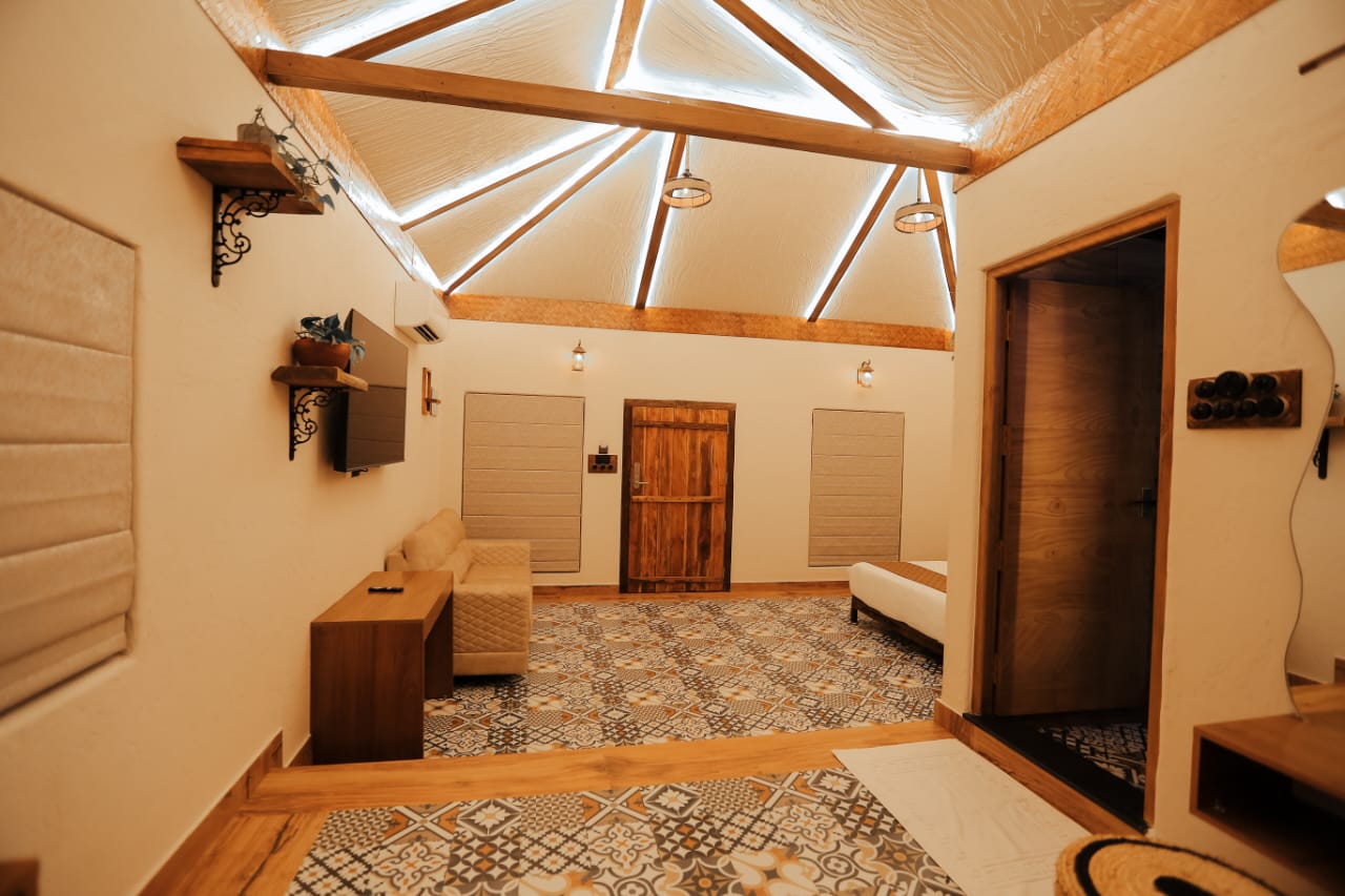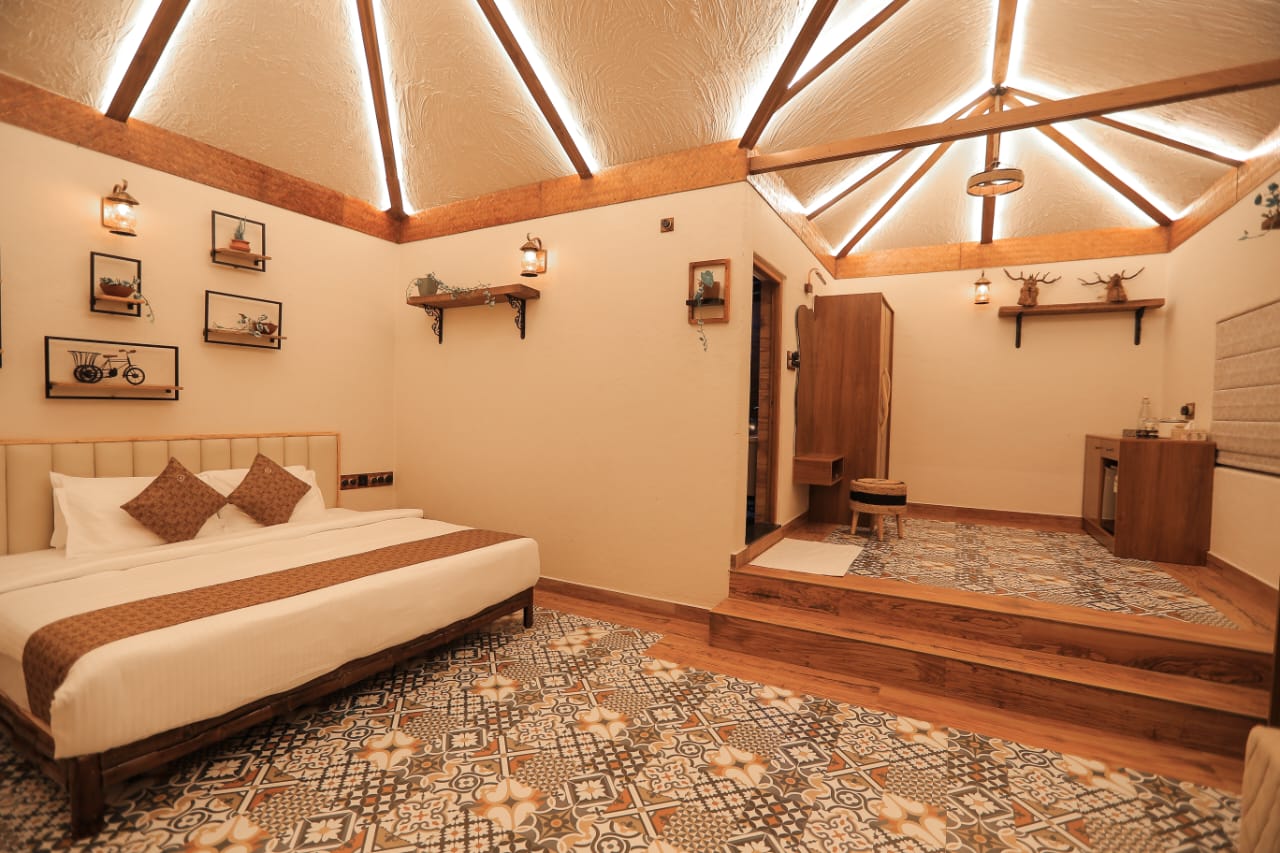 wooden interiors and warm, earthy tones that create an inviting ambiance. Indulge in the charm of an open-to-sky luxury