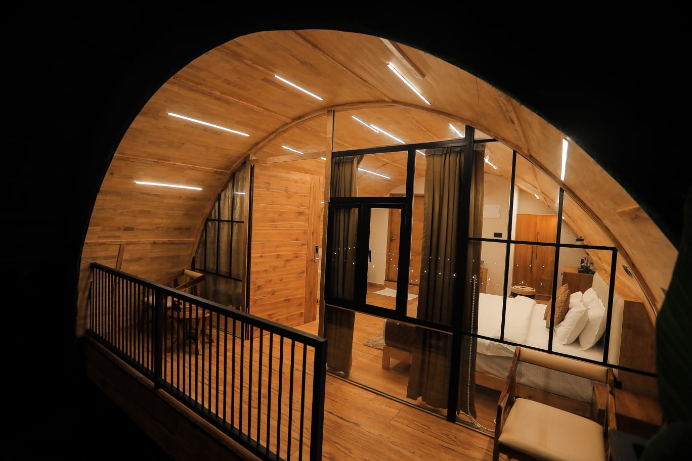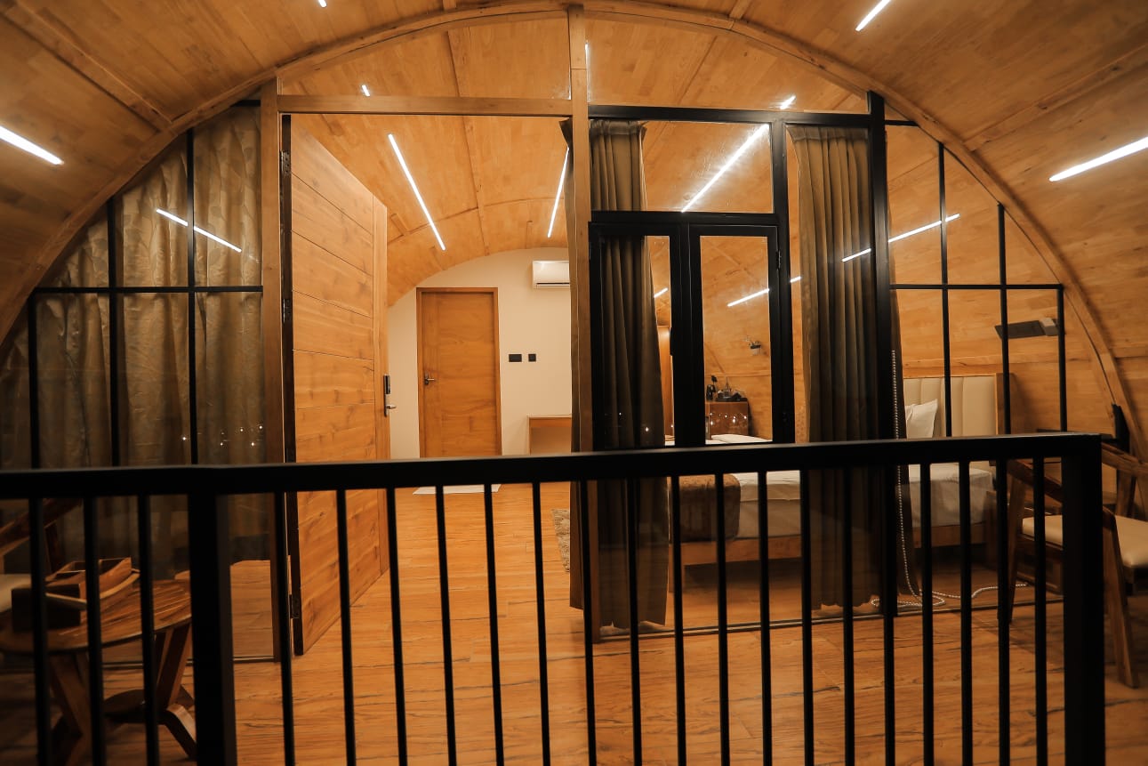 A single bedroom luxury half-round Architectural Pool Villa offering warmth and elegance. Half-round wooden design with wooden panel interiors and private pool.