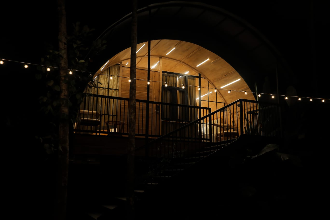 Our Eco Havan Pool Villa is designed to offer a unique and memorable stay experience. A luxury half-round Architectural Pool Villa offering warmth and elegance, featuring a half-round wooden design with wooden panel interiors. Tailored for honeymooners or guests seeking a serene, signature retreat. Each villa features modern amenities, artistic elements, and thoughtful touches to ensure a relaxing and inspiring stay.